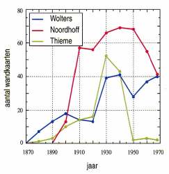 Deze drie uitgevers zijn in het vierde kwart van de 19de eeuw gestart met het uitgeven van schoolwandkaarten (Noordhoff wat later dan Wolters en Thieme), waarna bij alle drie in de loop van de 20e eeuw een sterke groei op trad. Het gevolg van de brand in 1944 in het pakhuis van Thieme is duidelijk te zien. Het aantal wandkaarten liep terug van 52 in 1930 naar slechts 2 in 1950. In de loop van de jaren '70 verdwenen de wandkaarten geheel uit het Thiemefonds. De dip in het aantal wandkaarten in het fonds van Wolters rond 1950 is veroorzaakt door het onverkoopbaar worden van acht Nederlands Oost-Indië kaarten (Noordhoff was veel minder op dit gebied gericht). Het gegeven dat in fig. 2 de lijnen van Wolters en Thieme bij elkaar liggen, en die van Noordhoff hoger ligt is goed verklaarbaar. Noordhoff had uitgebreide series klein formaat wandkaarten van de Nederlandse provincies, Europese landen en de werelddelen in haar assortiment, terwijl de wandkaarten van Wolters en Thieme doorgaans gedetailleerder en van een groot formaat zijn (150 à 250 cm in de hoogte en/of de breedte, vaak de onderwerpen Nederland, Nederlands Oost-Indië, Europa, Wereld). Vooral Wolters en Thieme waren dus aan elkaar gewaagd, en dit is weer in overeenstemming met het beeld dat in een van de jubileumboeken van Thieme wordt geschetst: Thieme onderhield vriendschappelijke betrekkingen met Noordhoff, maar er waren dikwijls irritaties in de verhouding met Wolters [Kalkwiek en Kalkwiek, 1992]. Ook uitgeven is natuurlijk maar mensenwerk. Het wordt tijd om de personen achter al die kaarttitels in tabel 1, auteurs en uitgevers, weer tot leven te brengen. We laten het verhaal beginnen in het jaar 1863.
