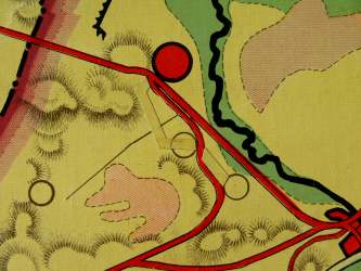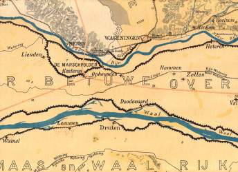 Figuur 5. Fragment (Wageningen en omgeving) van de 'Schoolkaart van Gelderland' van A.A. Beekman (fig. 4). De waterstaatkundige toestand krijgt veel aandacht (bijvoorbeeld de rivierdijken).