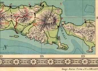 Figuur 6. Fragment (meest oostelijke gedeelte van Java) van de inzet 'Java en Madoera' (schaal 1 : 900.000) van de 'Schoolkaart van Insulinde' van R. Schuiling (1898, schaal hoofdkaart 1 : 2.700.000, twaalf bladen, 199 x 247 cm). Van de reliëfweergave (land en zeebodem) is veel werk gemaakt.