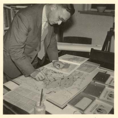 H. Rusch legt de laatste hand aan het rechter bovenblad van de 'Wandkaart van Nederland' (tweede druk, 1950). Let op de sigarendoosjes met plaatssymbolen.