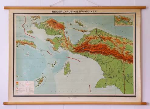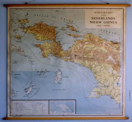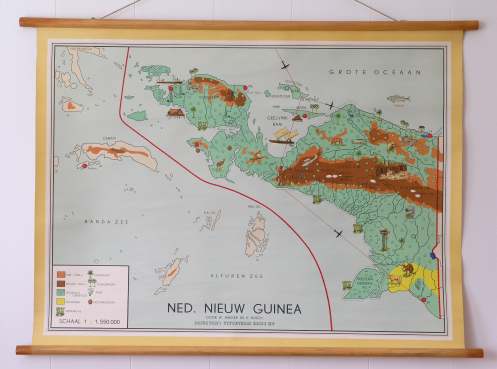 Due to the independence of Indonesia in 1949 (1945) the western part of New Guinea suddenly became the sole representation of The Netherlands in this region. Whereas school wall maps of Netherlands New Guinea were non-existent before 1950, after that they were the only kind of school wall map of the region published.