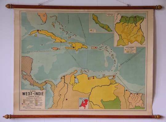 After the political troubles in the Dutch East Indies / Indonesia settled down in 1949, the somewhat neglected Dutch West Indies suddenly found themselves in the spotlight. The lack of ((school) wall) maps of Surinam and of the six islands which make up the Netherlands Antilles became clear. The few school wall maps of these areas which did exist before 1950 were not very useful [1]. An example is given in Figure 12. This map of the West Indies contains two much too small auxiliary maps of Surinam (scale 1 : 2.000.000) and of the main island of the Netherlands Antilles, Curaçao (scale 1 : 300.000).