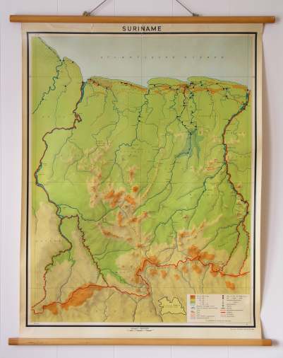 After 1950 the design of school wall maps ceased to be an additional job of school teachers and was gradually taken over by professional cartographers (for instance the ‘Cartografisch Instituut J.B. Wolters’). This is noticeable in the higher quality of the school wall maps of Netherlands New Guinea (period 1950-1962) and of Surinam (since 1950).