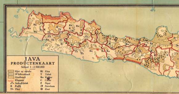 Figure 5. ‘Java Productenkaart’, scale 1 : 2.500.000. Map extract of ‘Wandkaart van Nederl.-Oost-Indië’, by W. van Gelder and C. Lekkerkerker, 1928, 7th edition, published by J.B. Wolters, 110 x 221 cm, scale 1 : 2.500.000.