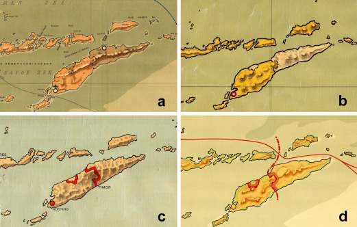 Figure 8. The island Timor. Map extracts of a: ‘Eenvoudige Wandkaart van Nederlandsch Oost-Indië’, by R. Noordhoff and H. Niehaus, 1915, published by J.B. Wolters, 182 x 219 cm, scale 1 : 2.750.000; b: ‘Schoolkaart van Nederlandsch Oost-Indië’, by G. Prop, 1929, 2nd edition, published by W.J. Thieme, 138 x 162 cm, scale 1 : 3.400.000; c: ‘Schoolkaart van Oost-Indië’, by J.J. ten Have, 1920, 4th edition, published by Joh. Ykema, 95 x 115 cm, scale 1 : 4.000.000; d: ‘Nederlandsch-Oostindië’, by A. Luinge and B. Stegeman, 1933, published by P. Noordhoff, 128 x 189 cm, scale 1 : 2.750.000.