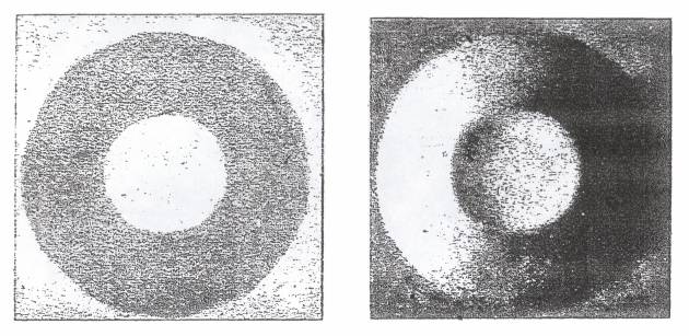 2. Door R. Noordhoff getekend bovenaanzicht van een afgeknotte kegel met loodrechte belichting (links) en met schuine belichting (rechts).