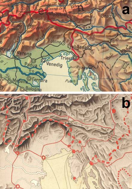 3. Fragment (Venetië en omgeving) van (a) schoolwandkaart Mittelmeerländer van H. Haack (1954, schaal 1:2.000.000) en van (b) schoolwandkaart Oostenrijk-Hongarije van R. Noordhoff (1899, schaal 1:1.600.000). De vergelijking is niet echt eerlijk aangezien de reproductietechniek in 55 jaar grote vooruitgang heeft geboekt.
