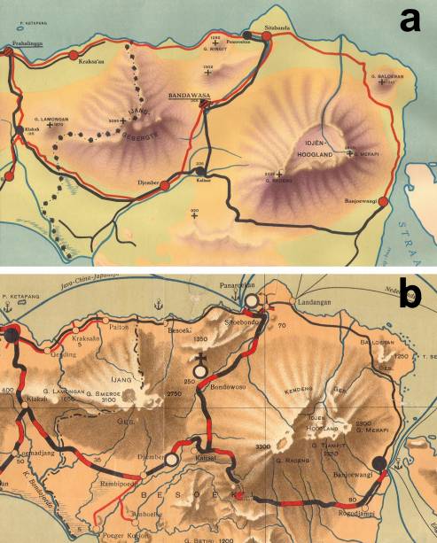 4. Fragment (meest oostelijke gedeelte van Java) van (a) schoolwandkaart Java en Madoera van de Topografische Inrichting (1923, schaal 1:500.000) en van (b) schoolwandkaart Eenvoudige Wandkaart van Nederlandsch Oost-Indië van R. Noordhoff en H. Niehaus (1916, schaal 1:750.000).