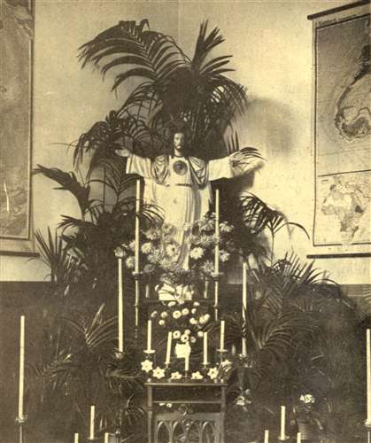 10. Studieklas van de kweekschool van de fraters met een Heilig Hartbeeld, een symbool van de toewijding van de kweekschool aan Jezus (foto uit 'Het vijf en zeventig jarig bestaan der kweekschool voor frater-onderwijzers', 1925). Aan weerszijden van het beeld hangen Duitse schoolwandkaarten (onder meer 'Bambergs Schulwandkarte von Afrika').