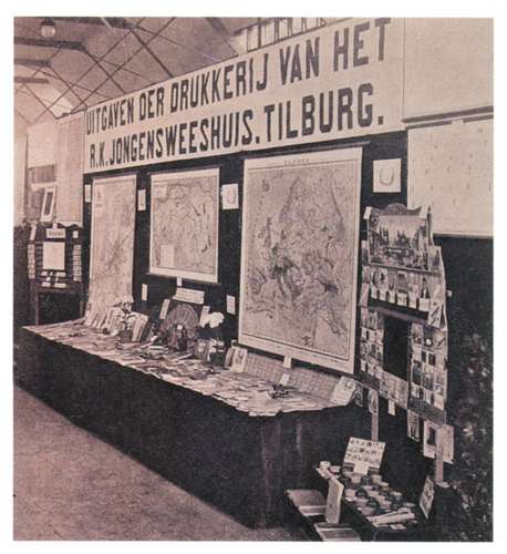 2. Tentoonstelling van de onderwijsuitgaven van het R.K. Jongensweeshuis met prominent aanwezige schoolwandkaarten (van voor naar achter: Europa, Noord-Brabant, Nederland (vierde druk, ca. 1920) en Palestina; foto uit [Caesarius Mommers en Janssen, 1997]).
