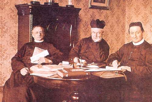 4. De redactie van 'De Engelbewaarder' in vergadering bijeen; v.l.n.r. de fraters Rafaël Klerkx, Barnabas Verhoeven en Jozef Reynders. Rafaël houdt een nummer van het tijdschrift en waarschijnlijk een rebus in zijn hand (foto uit [Caesarius Mommers en Janssen, 1997]).
