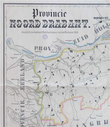 6. Fragment (Rozendaal en omgeving) van de schoolwandkaart 'Provincie Noord Brabant' van A.B. van Lieshout uitgegeven door A.J. Bogaerts te Breda (1857, schaal 1:100.000, collectie Bodel Nijenhuis Bibliotheek Universiteit Leiden). Plaatsen in Noord-Brabant zijn aangegeven met beginletters.