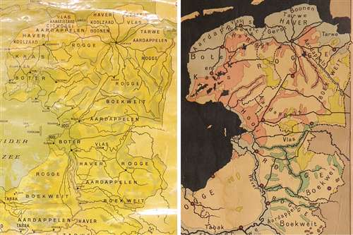 9. Noord- en Oost-Nederland; links: fragment van de 'Landbouwkaart van Nederland voor schoolgebruik' van J.A. ten Klooster (uitgave P. Engels & Zn. te Leiden, 1881, Bijzondere Collecties Bibliotheek Universiteit van Amsterdam); rechts: fragment van het grondsoortenkaartje van Rafaëls schoolwandkaart van Nederland (derde druk, ca. 1912). De productnamen vertonen vrij veel overeenkomsten.
