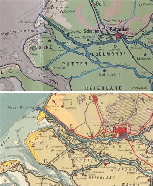 4. Rotterdam en omgeving; boven: fragment van een schoolwandkaart van Nederland van H. Schierbeek (tweede druk, 1886; collectie Bodel Nijenhuis, Bibliotheek Universiteit Leiden), onder: idem van Beekman (derde druk, 1908).