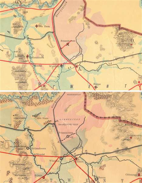 7. Almelo en omgeving; boven: fragment van de schoolwandkaart van Beekman (derde druk, 1908), onder: idem van Blink (1894). Blink heeft onder Friezenveen meer laagveen (grijs) aangegeven, Beekman volgt Staring.