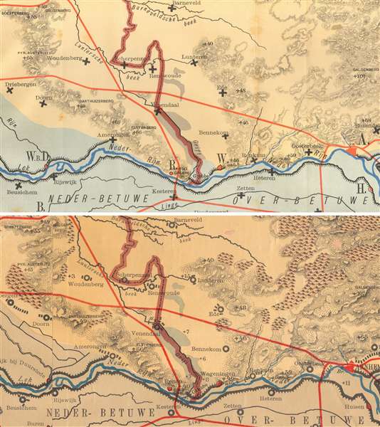 8. Wageningen en omgeving; boven: fragment van de schoolwandkaart van Beekman (eerste druk, 1888), onder: idem van Blink (1894). Blinks reliëfweergave is uitgebreider. Namen en hoogtecijfers van heuveltoppen zijn door Blink exact overgenomen van Beekman.