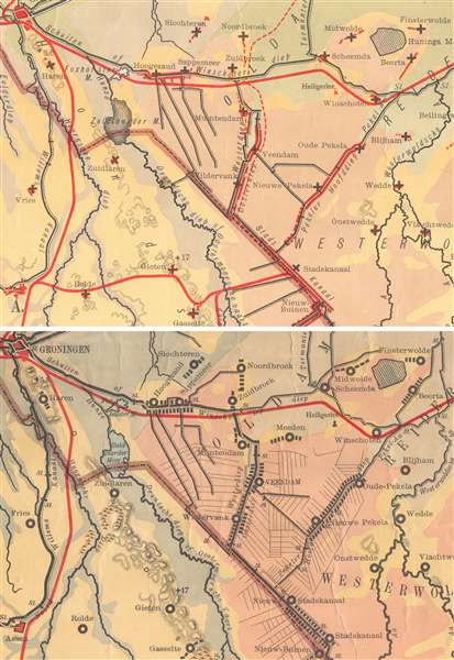 9. Veendam en omgeving; boven: fragment van de schoolwandkaart van Beekman (derde druk, 1908), onder: idem van Blink (1894). De lintbebouwing is bij Blink (zwarte rechthoekjes) duidelijker dan die bij Beekman (op spoorlijnen gelijkende rode lijnen).