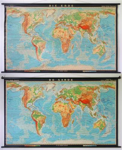 1. Die Erde van [H.] Haack en [W.] Painke uitgegeven door Justus Perthes in Darmstadt (zesde editie, [1968], schaal 1:16.000.000, 4 kaartbladen, 125 x 210 cm) met daaronder de licentie-uitgave De aarde van uitgeverij Dijkstra in Zeist uit 1968. Afgezien van de door Kooyman verzorgde Nederlandse beschrifting zijn de twee wandkaarten volkomen identiek.