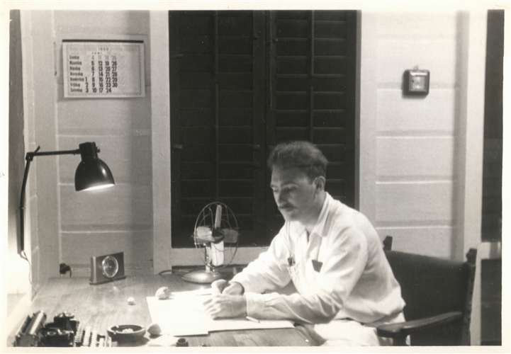 2. De kersverse aardrijkskundeleraar van Paramaribo, F. Ferrari, poseert in juni 1950 aan zijn nieuwe schrijfbureau in zijn houten huis aan de Gravenstraat. Thermometer, kalender en barometer hangen aan de wand.