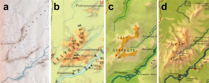 7. Weergave van het Lelygebergte op kaarten van Suriname met schaduwering; a: Bakhuis en De Quant (1930, 1:200.000), b: Dahlberg (1975-versie, maar identiek aan 1960-versie, 1:1.000.000), c: Eibergen en Ormeling (uitgave Wolters, tweede editie, 1965, 1:600.000), d: Painke en Ferrari (uitgave Dijkstra, tweede editie, 1969, 1:400.000).