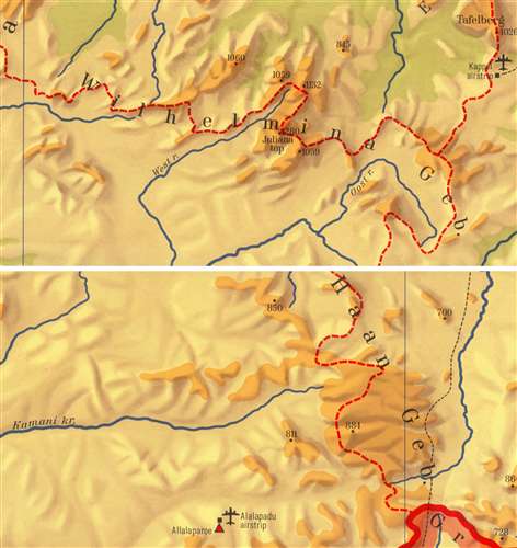 8. Weergave op de tweede editie van Painke en Ferrari (1969) van het jonge landschap van het Wilhelminagebergte (boven, schaduwering geeft een 'ruw' beeld) en het oude landschap van het Eilerts de Haangebergte (onder, schaduwering geeft een relatief vlak beeld).
