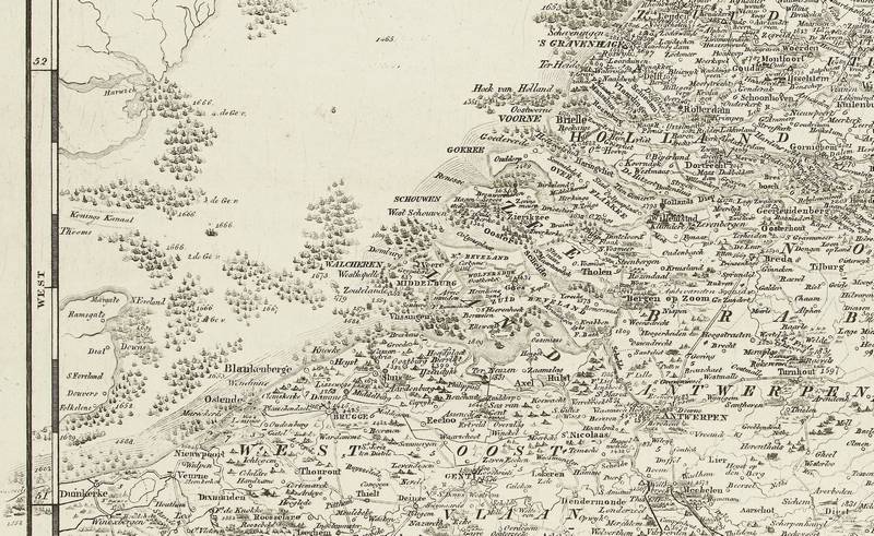 1. Fragment (Zeeland en omgeving) van de Geschiedkundige kaart der Nederlanden van Maaskamp uit 1830 (Collectie Rijksmuseum, Amsterdam). De kaart is overladen met details.