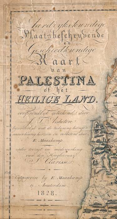 2. Aardrijkskundige plaatsbeschrijvende en geschiedkundige kaart van Palestina of het Heilige Land van Assheton, Maaskamp en Clarisse uit 1828 (1 kaart in 2 bladen, 88 x 57 cm, schaal [ca. 1:360.000], Collectie De Wereld aan de Wand, Nijmegen).