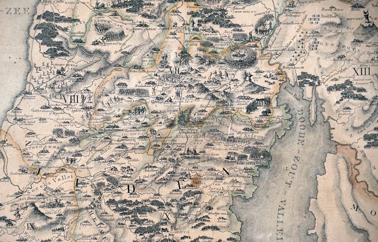 4. Fragment (Jeruzalem en omgeving) van de wandkaart van Palestina van Assheton, Maaskamp en Clarisse uit 1828.
