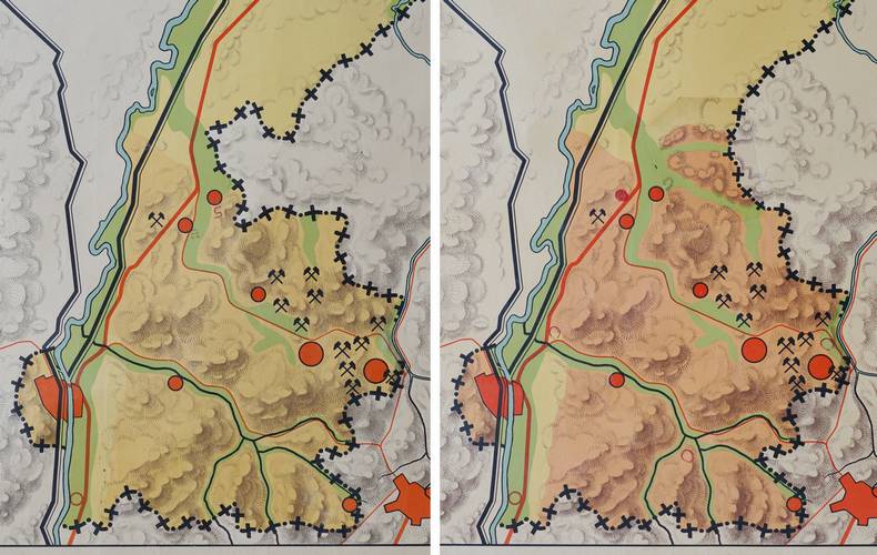 Figuur 1. Fragment (Zuid-Limburg) van de schoolwandkaart van Limburg van Van Hees en Nieuwhof uit 1934 (links) en van dezelfde schoolwandkaart met een in 1949 aangebracht plakkertje bij Tudderen (rechts).