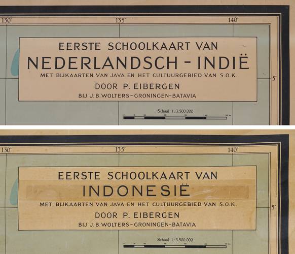 Figuur 2. Fragment (titelkader) van de Eerste schoolkaart van Nederlandsch-Indië van P. Eibergen uit 1942 (boven) en van dezelfde schoolwandkaart met een rond 1949 aangebracht plakkertje over 'Nederlandsch-Indië' (onder).