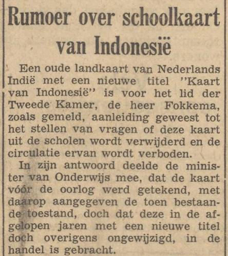 Wolters had rond 1940 nog twee grote concurrenten: Thieme in Zutphen en Noordhoff in Groningen. Alle schoolwandkaarten van Thieme zouden echter door een bombardement in 1944 in rook opgaan [Brink, 2005], zodat na de Tweede Wereldoorlog alleen Noordhoff nog overbleef. Deze was na 1945 met frisse moed weer begonnen en wist al in 1949 met een geheel nieuwe schoolwandkaart getiteld Indonesië op de proppen te komen. En daar was geen knip- en plakwerk aan te pas gekomen. Het zal druk op de ketel hebben gezet bij Wolters en Eibergen om ook met iets nieuws te komen, maar de politieke onzekerheid weerhield ze voorlopig. Na de overdracht van de souvereiniteit in december 1949 aan de 'Republiek der Verenigde Staten van Indonesië' en de vorming van een 'Nederlands-Indonesische Unie' [Dalhuisen et al, 2017] leek echter de tijd rijp voor Wolters om haar rol als marktleider weer op zich te nemen. De Lijst van uitgaven van september 1950 kondigde de komst aan van een Eerste schoolkaart van Oost-Indonesië van Eibergen. Oost-Indonesië was een van de deelstaten van de Verenigde Staten van Indonesië en bevatte onder meer de Molukken, die in Nederland in de belangstelling stonden. Maar op 17 augustus 1950 - precies vijf jaar na de eerste 'proklamasi' - gooide het uitroepen van de Republiek Indonesië, die in plaats kwam van de Verenigde Staten van Indonesië, roet in het eten [Buiter, 1993]. Eibergen kreeg een déja vu en zette de plannen in de ijskast. De kaart zou nog tot 1954 als 'ter perse' blijven staan in de uitgavelijst en zou daarna spoorloos verdwijnen. Wat Eibergen nog wel aandurfde in 1952 was een bijna identieke herdruk van de bestaande Eerste schoolkaart met alleen twee hoogst nodige aanpassingen: Indonesië in de titel (plakken was dus niet meer nodig) en Batavia werd Djakarta (zie figuur 3). Aan een dergelijke kaart zou niemand aanstoot kunnen nemen, dacht Eibergen. Maar hij had geen rekening gehouden met dominee Fokkema.