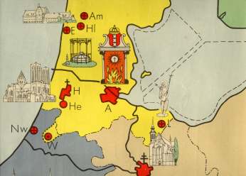 Fragment (Amsterdam en omgeving) van de tweede druk van de 'Wandkaart Katholiek Nederland' door A.H. van Luyn (1956).