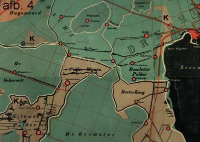 Afb. 4. Fragment van de Noord-Holland-kaart (1905) van Kloeke; in drie gebieden tussen Hoorn en Alkmaar (aangegeven door K) is de zeeklei uit Starings kaart veranderd in laagveen.