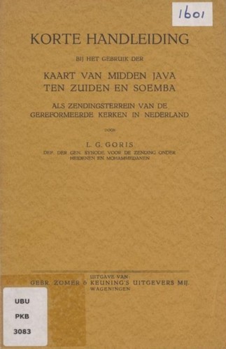 Handleiding: L.G. Goris, Korte handleiding bij het gebruik der kaart van Midden Java ten zuiden en Soemba als zendingsterrein van de Gereformeerde Kerken in Nederland. - Wageningen : Gebr. Zomer & Keuning, [1926] foto omslag |