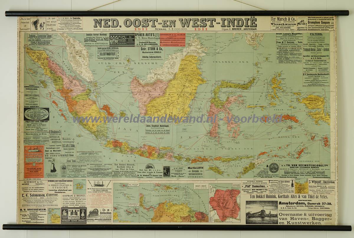 OIN_BXNed. Oost- en West-Indië A. de Moor jaar: 1911 drukker: Haarlem : Emrik & Binger omvang: 1 kaartblad hoogte: 68 ( 98 ) cm breedte: 143 ( 149 ) cm schaal 1 : 2.000.000 [onjuist]