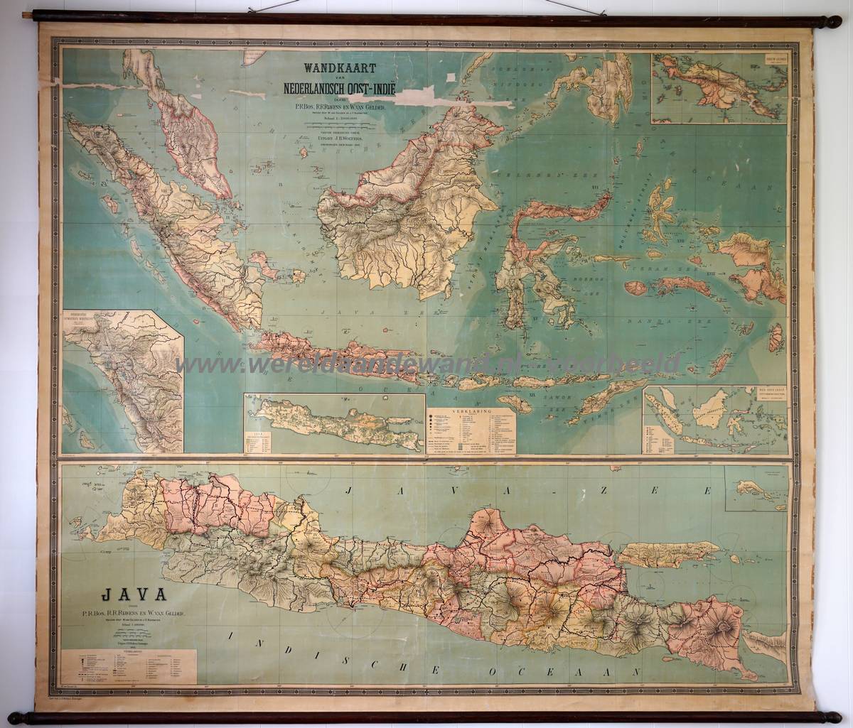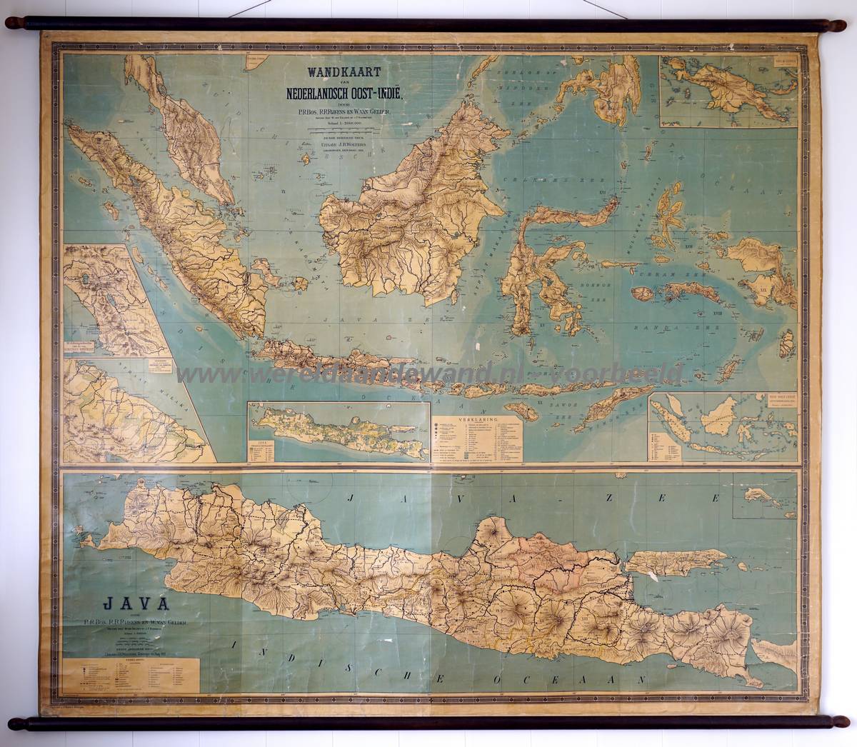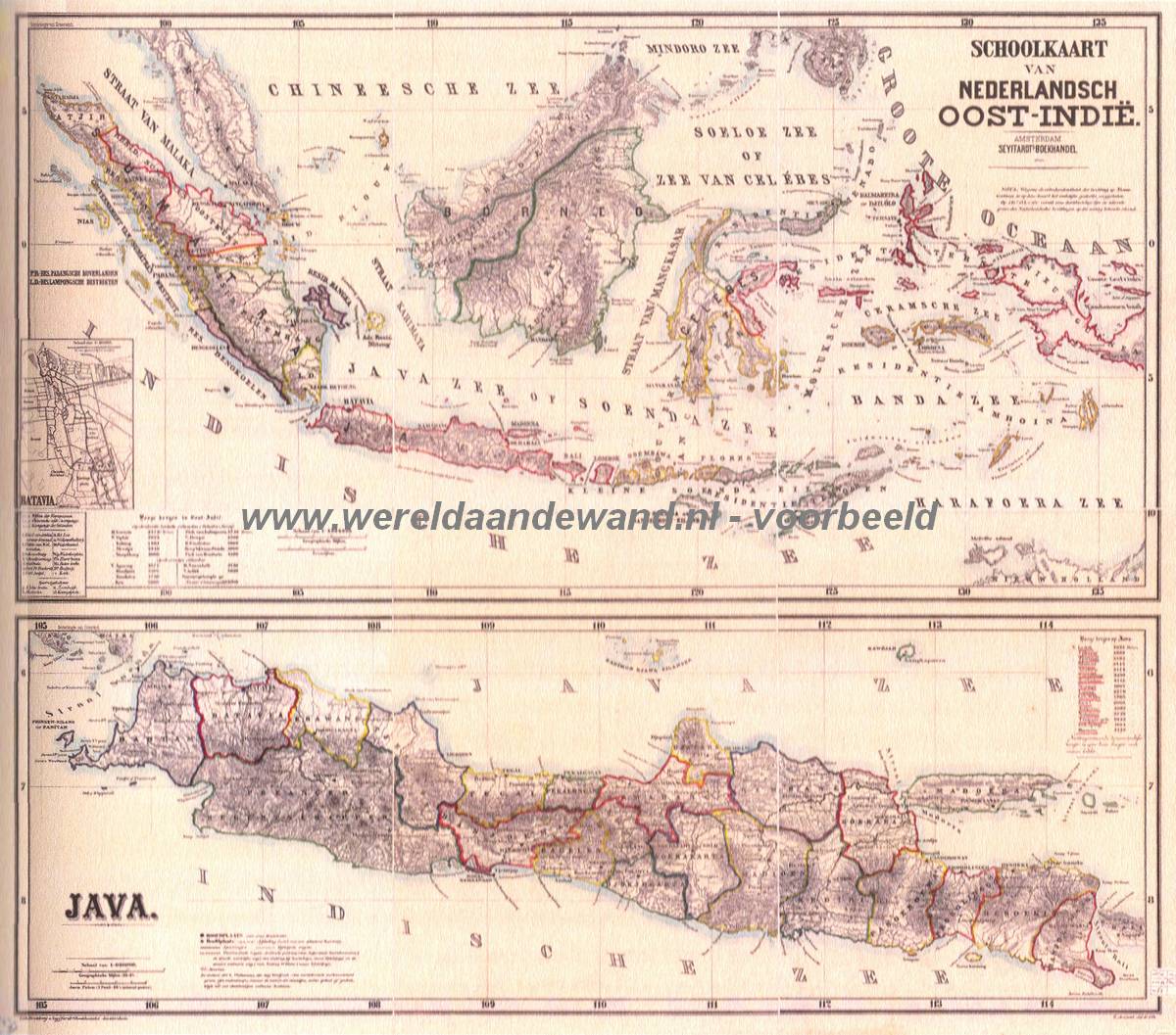 Opm.: De bijkaart van Java was vanaf de tweede druk ook afzonderlijk verkrijgbaar (zie OIN_WO1J). Vanaf de zevende druk was de wandkaart van Nederlands Oost-Indië leverbaar met en zonder de bijkaart van Java. |