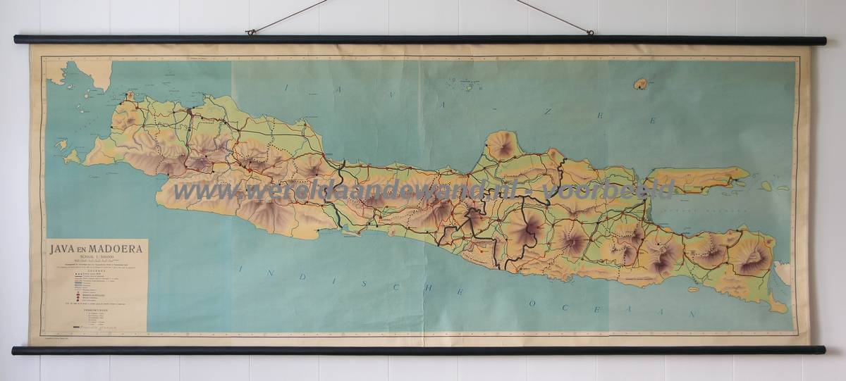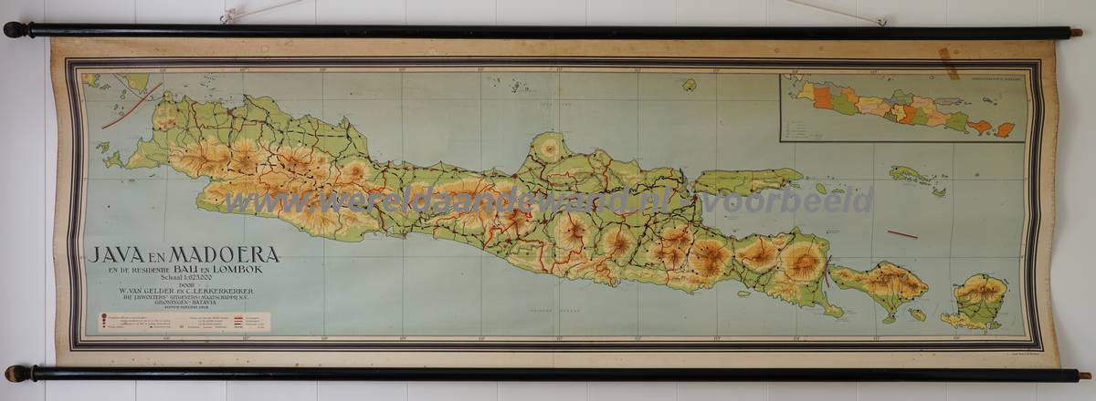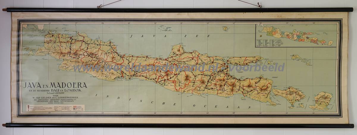 OIN_WO9CWandkaart van Nederlandsch-Indië / Java en Madoera en de residentie Bali en Lombok W. van Gelder, C. Lekkerkerker jaar: [ 1939 ] druk: 9e (Java 8e druk) omvang: 1 kaart in 5 bladen hoogte: 158 ( 172 ) cm breedte: 207 ( 221 ) cm schaal 1 : 2.500.000 / 1 : 625.000