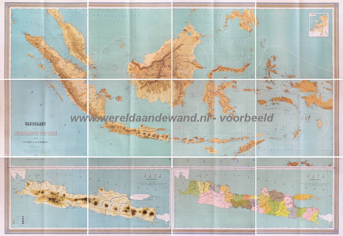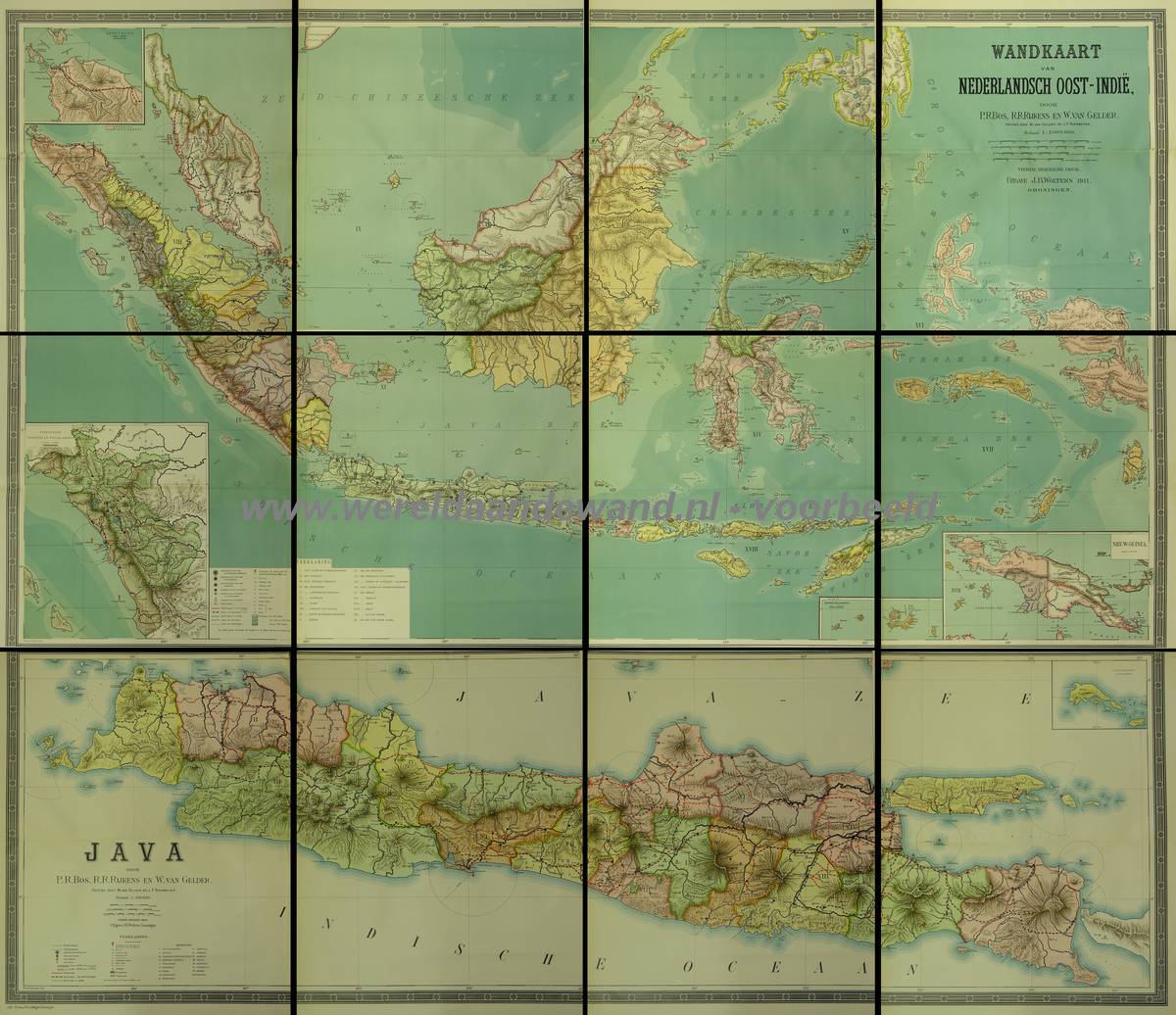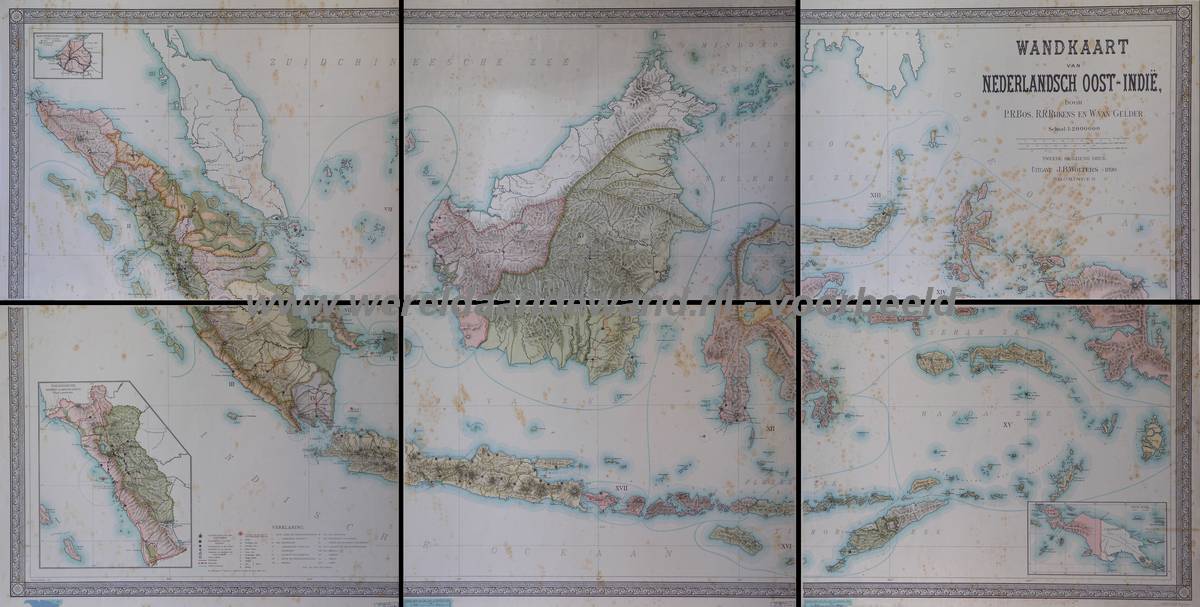 OIN_WO2BWandkaart van Nederlandsch Oost-Indië P.R. Bos, R.R. Rijkens, W. van Gelder jaar: 1890 druk: 2e drukker: Groningen : v.d. Weijer omvang: 1 kaart in 10 bladen (Java in 4 bladen) hoogte (blad): 53 ( -- ) cm breedte (blad): 72 of 77 ( -- ) cm schaal 1 : 2.000.000