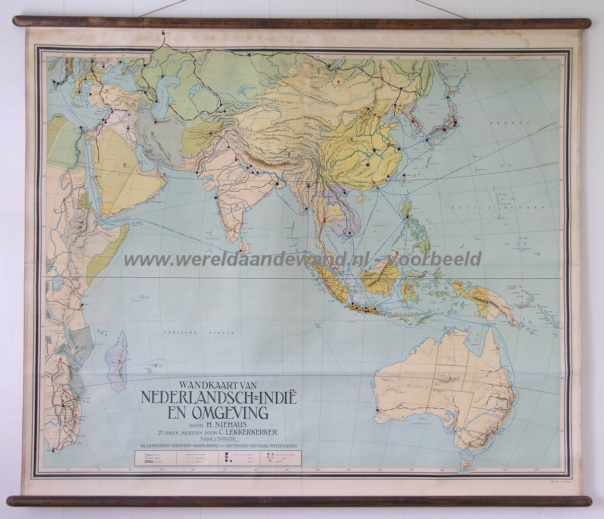 OIN_WO2LWandkaart van Nederlandsch-Indië en omgeving H. Niehaus, C. Lekkerkerker jaar: [ 1929 ] druk: 2e omvang: 1 kaart in 4 bladen hoogte: 119 ( 136 ) cm breedte: 150 ( 163 ) cm schaal 1 : 9.000.000 |
